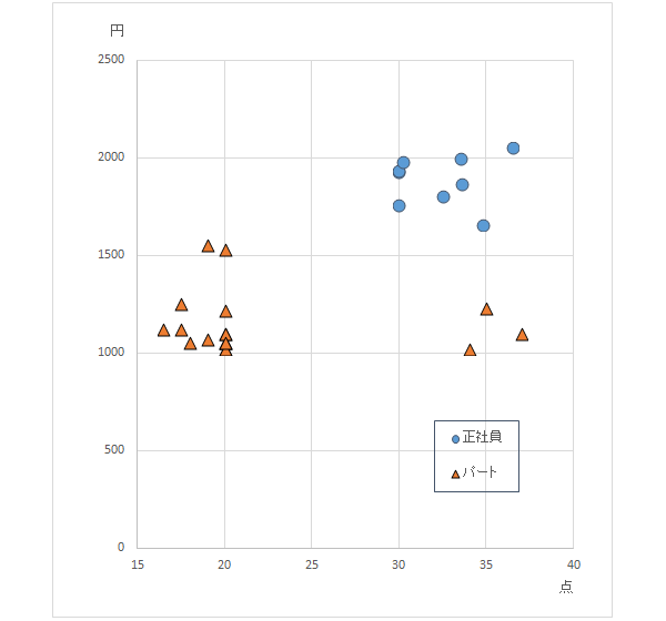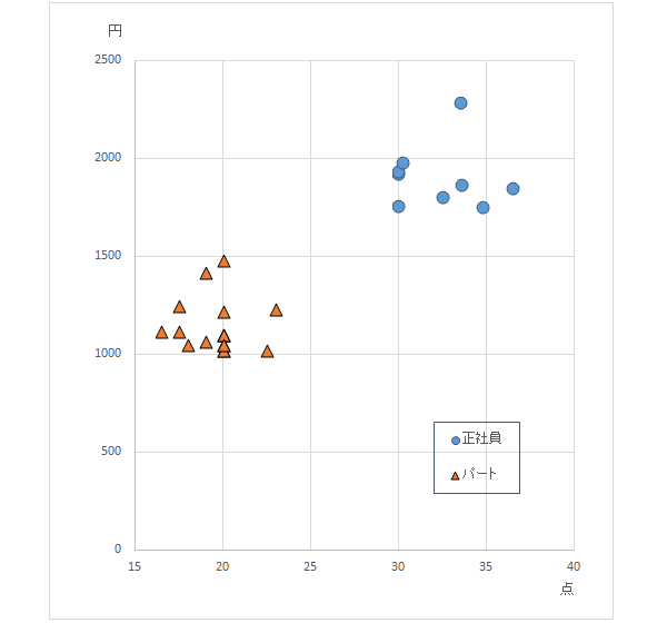 正社員とパート・契約社員のジョブサイズと時給プロット図